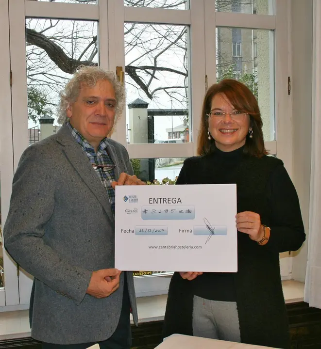 El presidente de la Asociación Empresarial de Hostelería de Cantabria (AEHC), Ángel Cuevas, ha hecho entrega de los más de 2.000 euros recaudados en la XXXV Gala de Hostelería a la presidenta de la asociación Amica, Mercedes del Hoyo.