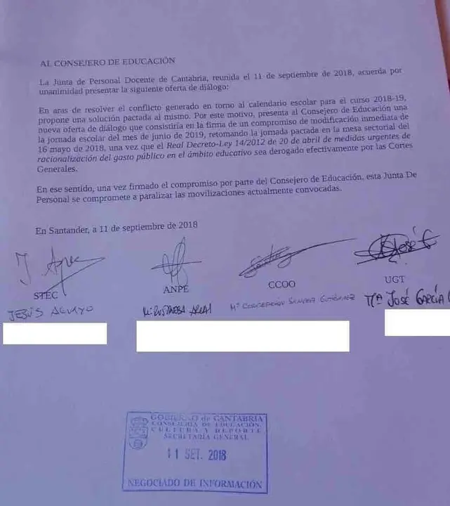 La Junta de Personal Docente de Cantabria reunida el 11 de septiembre de 2018, acuerda por unanimidad presentar la siguiente oferta de dialogo: