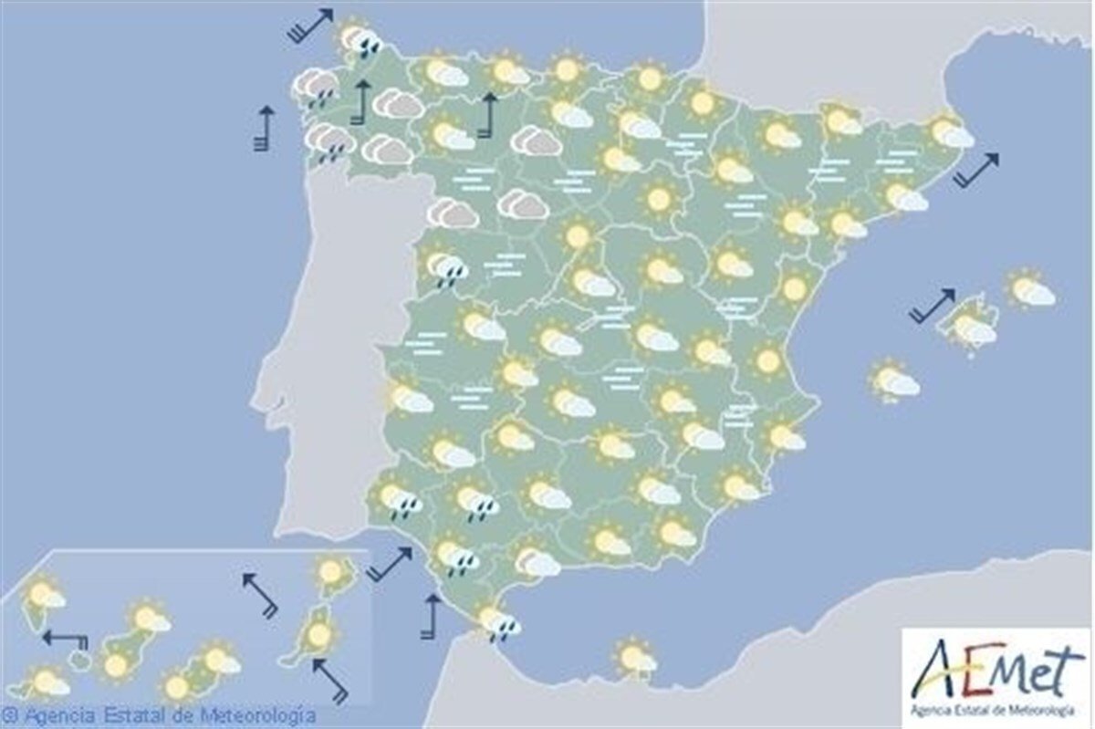 El viento de componente Sur predominará sobre la Península y Baleares, rolando a Oeste en Galicia y Cantábrico, y será fuerte o con intervalos de fuerte en el entorno del litoral gallego, área cantábrica y, al final del día, en Pirineos. Será de componente Este en Canarias.