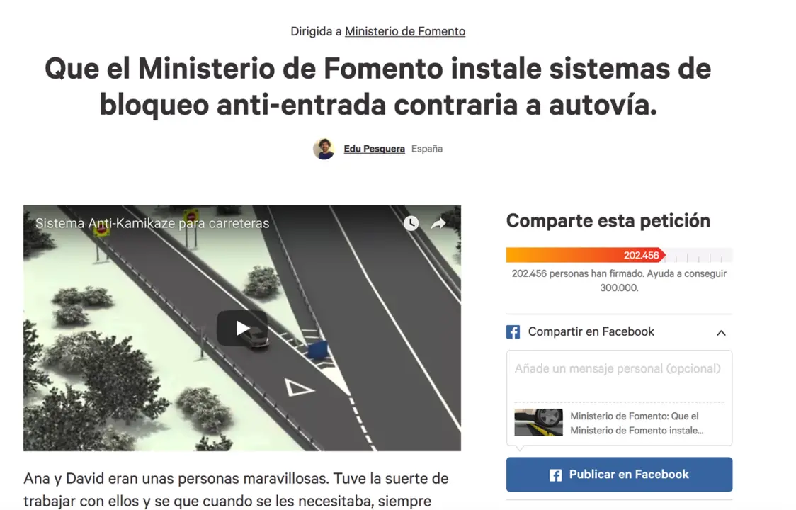 La petición en la plataforma web Change.org para demandar al Ministerio de Fomento la instalación de sistemas de bloqueo que impidan que se pueda entrar en las autovías en sentido contrario suma más de 200.000 firmas en 9 días.
