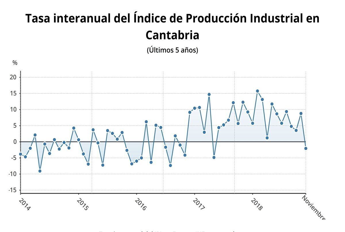 La producción industrial cayó un 2,1% en Cantabria en noviembre en comparación con el mismo mes de 2017, según ha informado este viernes el Instituto Nacional de Estadística (INE).