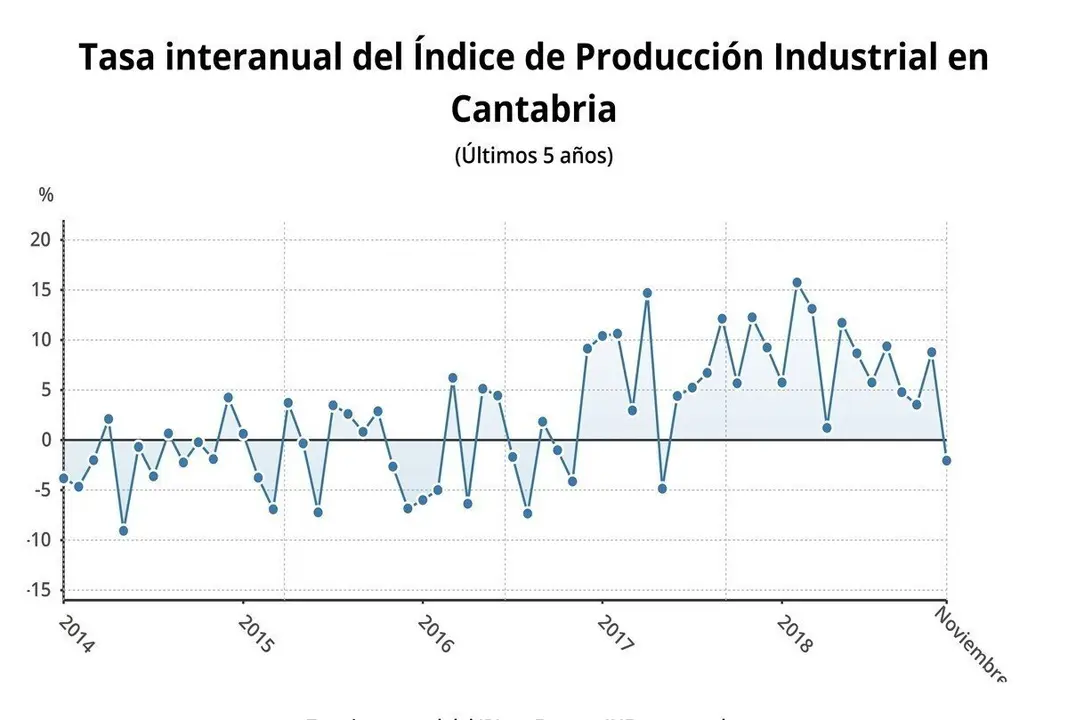 La producción industrial cayó un 2,1% en Cantabria en noviembre en comparación con el mismo mes de 2017, según ha informado este viernes el Instituto Nacional de Estadística (INE).