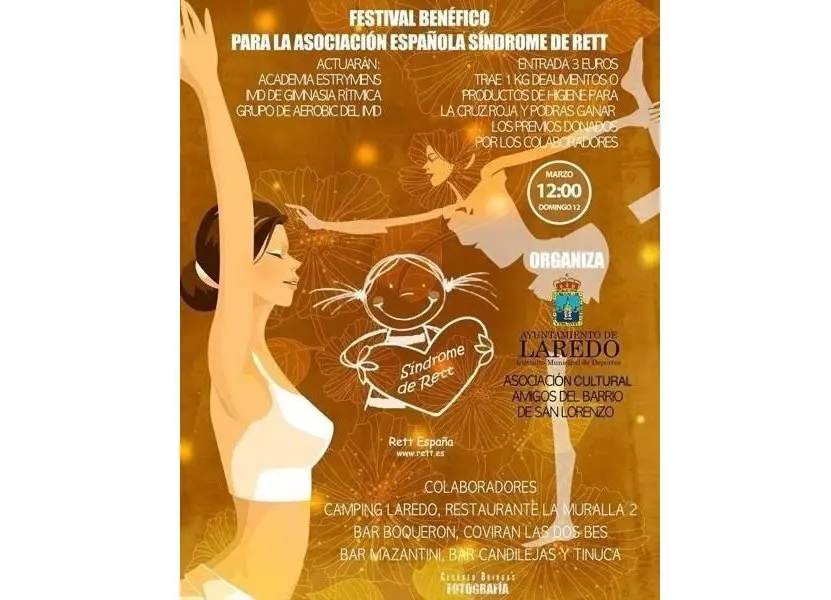 El Instituto Municipal de Deportes del Ayuntamiento de Laredo y la Asociación Cultural Amigos del Barrio de San Lorenzo han organizado un Festival Benéfico a favor de la Asociación Española Síndrome de Rett, que tendrá lugar este domingo, 12 de marzo, a las 12 horas en el polideportivo Emilio Amavisca. Actuarán Academia Estrymens, el Instituto Municipal de Deportes de Laredo de Gimnasia Rítmica, y Grupo de Aérobic del IMD de Laredo. La entrada cuesta 3 euros y, quienes aporten un kilo de alimentos o productos de higiene para la Cruz Roja podrán ganar los premios donados por los colaboradores. El festival tenía que haberse celebrado el pasado 12 de febrero, pero se suspendió por el trágico accidente en el puerto de Laredo en el que fallecieron dos jóvenes de la villa al caer el coche en el que viajaban al agua.