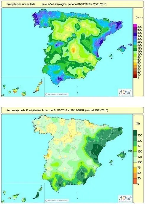 Las lluvias acumuladas desde que comenzó el año hidrológico el pasado 1 de octubre hasta el 20 de noviembre han alcanzado un valor de 177 litros por metro cuadrado, lo que representa un 37 por ciento más que el valor medio normal en ese periodo, según la Agencia Estatal de Meteorología (AEMET).