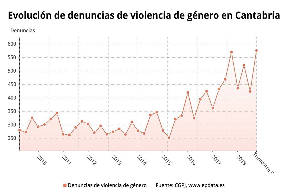 En las denuncias, figuraban como víctimas 610 mujeres (514 españolas y 96 extranjeras), que representan a 20,43 de cada 10.000 mujeres que residen en Cantabria, una ratio superior a la media nacional, que durante el tercer trimestre de 2018 ascendió a 17,10 víctimas por cada 10.000 mujeres