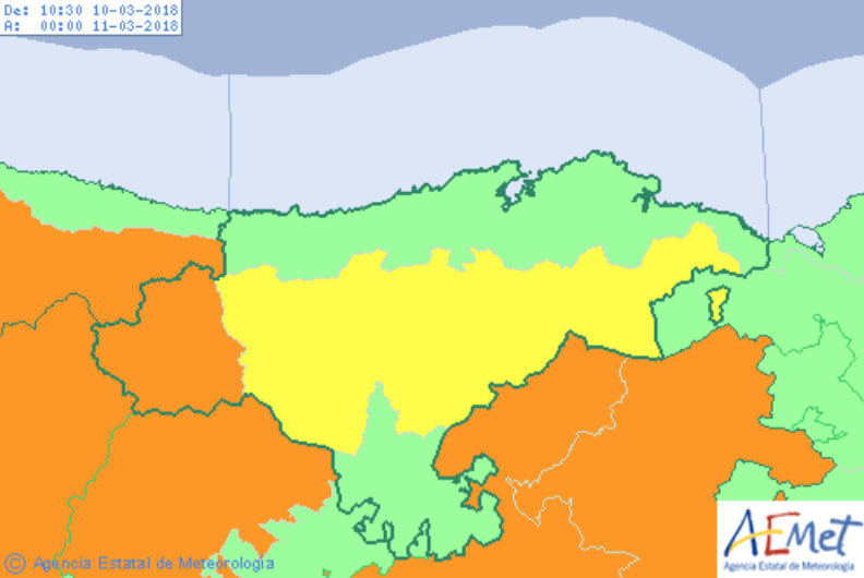 De manera tanto previa como posterior a la activación del nivel naranja en todos los casos, estará vigente el aviso amarillo, también activado en periodos alternos durante todo el fin de semana en la Cantabria del Ebro.