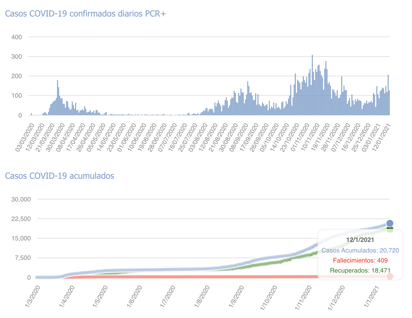 Os dejamos la tabla con los últimos datos facilitados por Sanidad, sumados los de ayer martes 12 de enero de 2021 hasta las 23:59h.