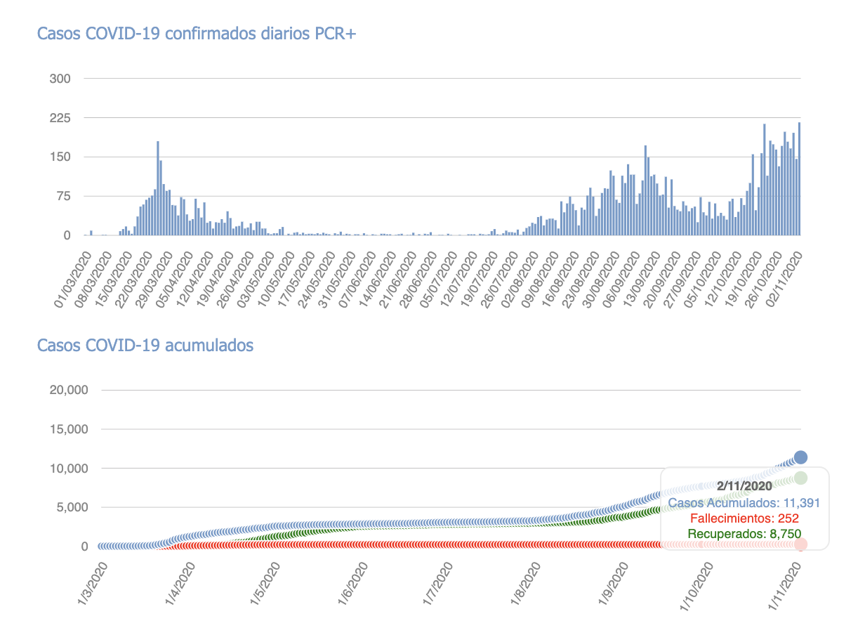Os dejamos la tabla con los últimos datos facilitados por Sanidad, sumados los de ayer día 2 de noviembre de 2020 hasta las 23:59h.