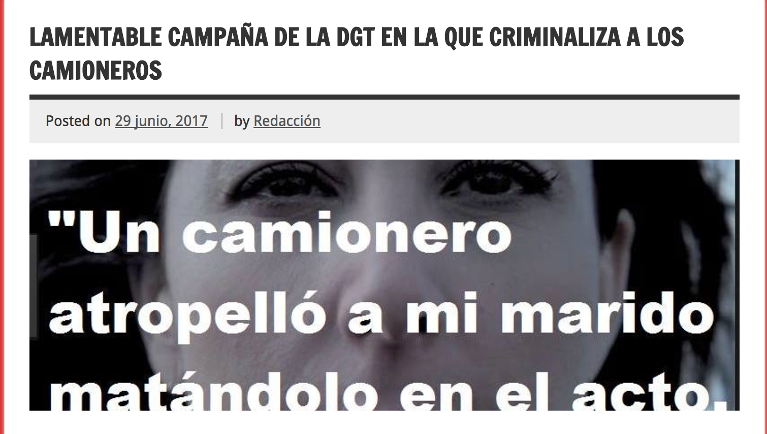 "Porque no ponen también la DGT al Sargento de la Guardia Civil que ayer mató a tres personas dando positivo en alcohol y drogas? Vamos esto se pasa, que somos los únicos este sector!! mal empezamos, menudo anuncio." así comienza el descargo en la web www.forodeltransporteprofesional.es y es que los camioneros del pais "han pasado de ser un gremio respetado a unos apestados". Los foros de transportistas y los grupos de whatsapp braman contra la campaña de la DGT que inicia uno de los promocionales de concienciación con "Un camionero atropelló al marido de Anna González y ni siquiera se paró. «Por no guardar un pequeño vacío, dejó un inmenso vacío en mi familia». «Solo nos separa de la muerte metro y medio»," testimonia en el spot. Prosigue la denuncia en el foro del transporte, "Hoy he visto la nueva campaña de la DGT y comienza: “Un camionero mató a mi marido”, la verdad es que nada justifica una muerte, pero se está discriminado a un gran colectivo con sus aciertos y errores como todos y deberían de haber pensado el día a día del camionero, las largas horas de espera, la fatiga la poca sensibilidad que tienen hacia nosotros en las fabricas en los puertos etc etc… No quiero justificar nada pero me parece lamentable que la DGT comience así su campaña" La imagen que circula por los whatsapp del mundo del transporte como respuesta a la campaña de Dirección General de Tráfico es la que ven a continuación, es palpable el enfado del mundo del transporte y el motivo.