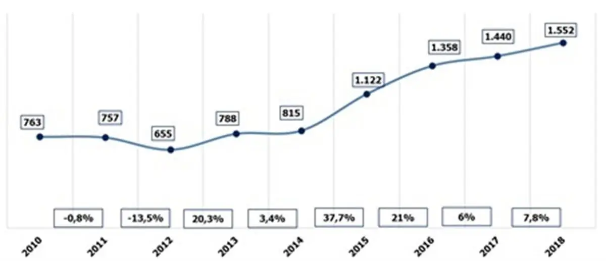 Analizando la serie histórica, el análisis refleja que, tras registrar más de 700 contratos en 2010, el volumen de contratos hechos a personas con discapacidad descendió durante dos años consecutivos y registró la cifra más baja (655) en 2012. Desde ese punto, la cifra ha aumentado 6 años de manera consecutiva hasta alcanzar los 1.552 contratos en 2018. En total, el número de contratos firmados por profesionales con discapacidad se ha duplicado respecto a 2010.