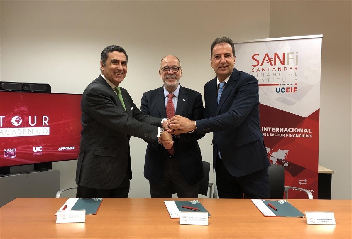 El director general de la Fundación UCEIF y SANFI, Francisco Javier Martínez, junto con el presidente de APROMES, Javier García-Bernal, y el fundador y director de IDECIDE, Alberto Hoyos, han firmado en la sede de SANFI Madrid el Convenio de colaboración que une a las tres marcas en una alianza estratégica para la promoción y desarrollo de los Tours Académicos 2019.