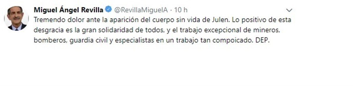 Además, en su tweet, también ha tenido un reconocimiento al trabajo realizado por la Guardia Civil, bomberos, Protección civil, el Cuerpo de Rescate Minero, voluntarios y empresas que han colaborado en el rescate.