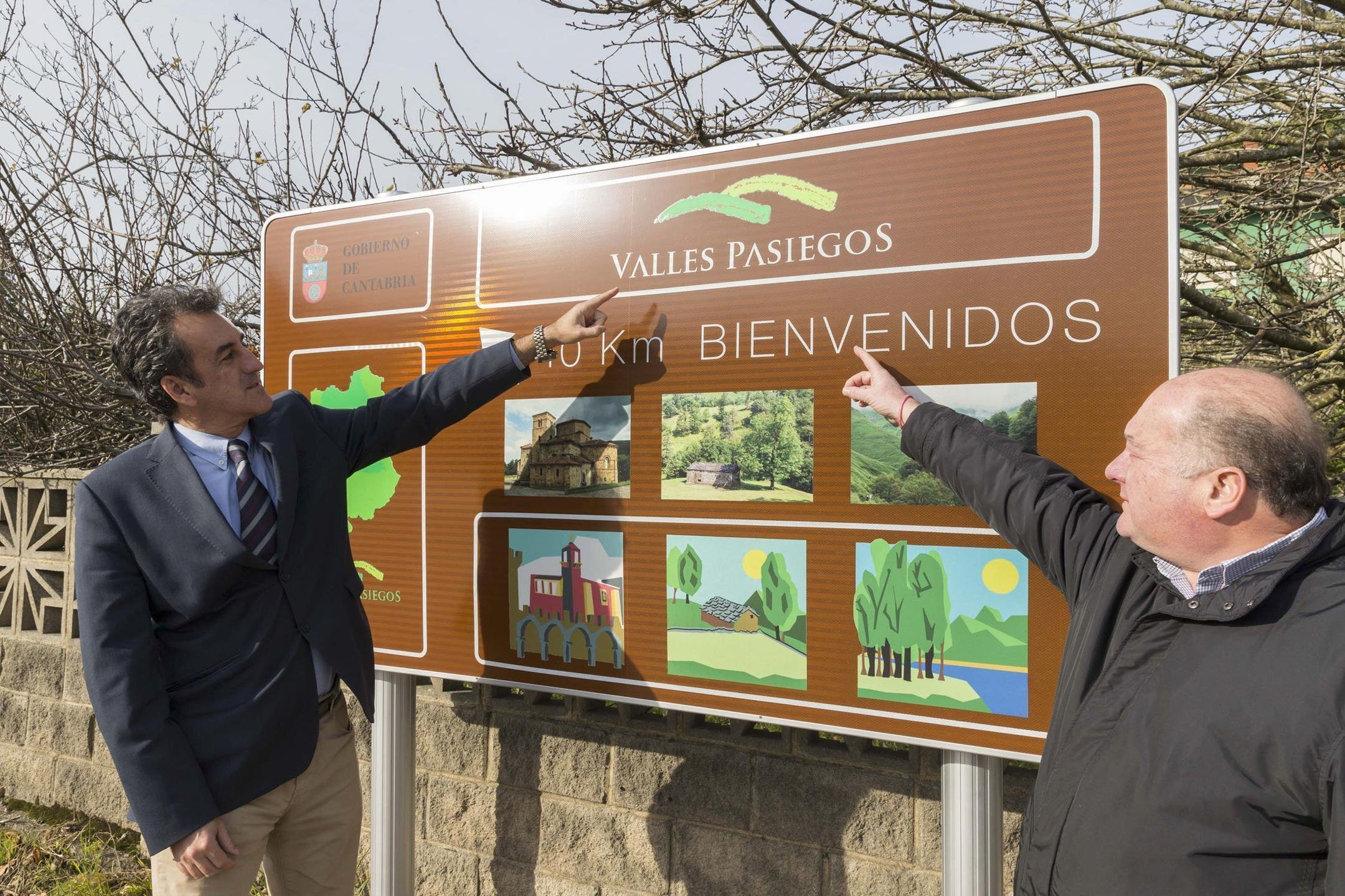 El consejero de Innovación, Industria, Turismo y Comercio, Francisco Martín, acompañado del presidente del Grupo de Acción Local Valles Pasiegos, Ángel Sainz Ruiz, y de la gerente, Ana Manrique, ha comprobado la instalación de los primeros carteles de la señalización turística de los Valles Pasiegos como destino turístico. En esta primera fase se han colocado 50 carteles de dirección, 10 paneles de bienvenida y 3 monolitos explicativos con mapas de la zona. De momento se ha completado el Valle del Pisuerga, y en las fases posteriores se realizarán el Valle del Pas y el Valle del Miera. Según ha comentado Martín, el objetivo de esta señalización es el de asegurar, con un número reducido de carteles, el recorrido claro y exhaustivo de los recursos e itinerarios de interés de la comarca. De esta manera, se está procediendo a revisar las señales existentes completándolas cuando resulte necesario o se pretenda reforzar la promoción de un recurso en particular, facilitando su ubicación en los valles. La señalización permitirá una lectura clara mediante carteles metálicos muy visibles en los itinerarios rodados y de menor impacto en los centros urbanos, utilizando para ello diferentes niveles de tamaño y coloración, dependiendo de la información que se aporta: (marrón para promoción del destino y dirección de los pueblos más importantes; morado para señalización direccional de los recursos y verde para los paneles informativos y direccionales en los cascos urbanos). Martín ha destacado que los Valles Pasiegos constituyen un destino turístico de primer orden para Cantabria por su situación privilegiada a 17 kilómetros de la costa, por su paisaje natural, por su gastronomía de lácteos y carnes de extraordinaria calidad, por sus pueblos tranquilos y el carácter hospitalario de sus gentes y por un estilo de vida pausado y tradicional, “que es testimonio de la historia y cultura pasiegas”, ha dicho Martín que también se ha referido a otros recursos turísticos de estos valles como “su riquísimo patrimonio construido, sus casonas, palacios, iglesias y la tipología arquitectónica única de la cabaña pasiega, que vive un esplendor con rehabilitaciones en los últimos años para uso vacacional, sin olvidar que es un lugar idóneo para el disfrute del entorno rural por medio de rutas, senderos verdes, paseos culturales y cuevas”, ha señalado el consejero de Turismo. Los Valles Pasiegos Los Valles Pasiegos abarcan el territorio de las cuencas fluviales de los ríos Pas, Pisueña y Miera, que surcan de norte a sur el corazón de Cantabria, marcando con nitidez la separación entre sus zonas oriental y occidental. Conforman una comarca homogénea en lo físico con frondosos valles y extensas praderas que ofrecen al visitante una diversidad de matices verdes, pardos y amarillos. Los tres valles componen una unidad cultural y social de la comunidad campesina que los ocupa, definiendo una forma de vida original, adaptada a la ganadería trashumante de vacuno, que modela un paisaje excepcional, con un tipo de construcción autóctona -la cabaña pasiega- que refleja con fidelidad esa interacción entre el hombre y el paisaje a lo largo de los últimos cinco siglos. El Grupo de Acción Local Valles Pasiegos lo integran 16 municipios: Castañeda, Corvera de Toranzo, Liérganes, Luena, Miera, Penagos, Puente Viesgo, San Pedro del Romeral, San Roque de Riomiera, Santa María de Cayón, Santiurde de Toranzo, Saro, Selaya, Vega de Pas, Villacarriedo y Villafufre. El plan de señalización de los Valles Pasiegos incluye un proyecto de señalización a lo largo de la Autovía A-67, con indicación de las salidas hacia cada uno de ellos, aunque los ejes vertebradotes son las carreteras CA-142, la N-634 y la CA-260. La promoción y señalización de los valles como destino turístico y de los recursos más importantes se apoyarán en estas vías, así como en las que sirven de conexión entre los valles (CA-264 entre San Roque y Selaya y la CA-263 entre Selaya y Entrambasmestas, pasando por Vega de Pas). Promoción, dirección e información Las señales que promocionarán los Valles Pasiegos son de tres tipos, de promoción (carteles de mayor tamaño en las vías principales y vías de conexión entre valles, que informan al viajero del patrimonio natural, social y construido y que estarán acompañadas de monolitos en las entradas a localidades de interés); de dirección (con grafismo muy visible y situadas en las vías principales, cruces con carreteras de conexión entre valles o desvío hacia localidades o recursos principales, como bienes de interés cultural) y de información (paneles de los valles con relato de sus características principales y lugares de interés que se instalarán en zonas urbanas concurridas y núcleos con mayor concentración de monumentos, como Liérganes, Selaya o Castillo Pedroso).
