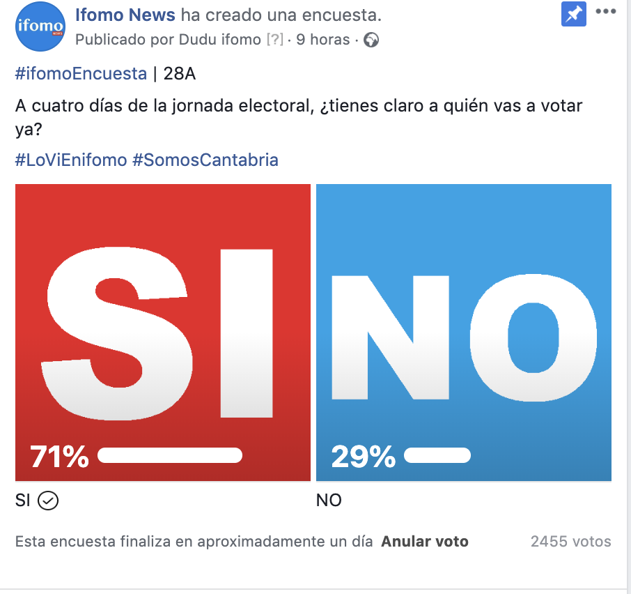 Con un número tan elevado de votantes, podemos decir que se trata de la encuesta más amplia publicada hasta ahora, frente a, por ejemplo el CIS, que apenas preguntó a 300 cántabros, o a la de GAD3 para El Diario Montañes con 400, en la encuesta de ifomo ya han votado 2.469 usuarios.