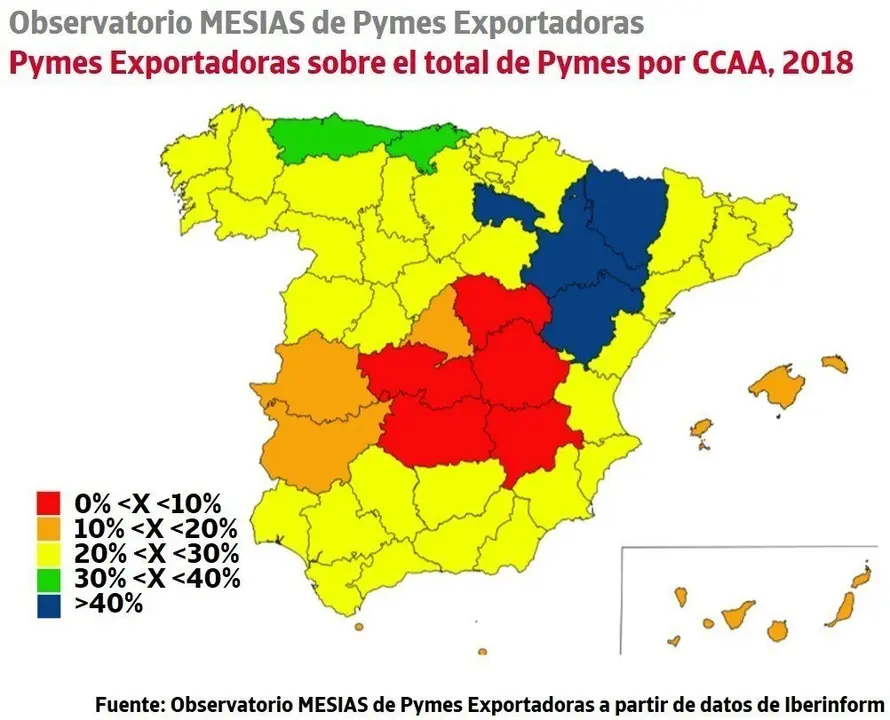 En la parte alta de la tabla destacan Aragón y La Rioja, en las que más del 40 por ciento de las pymes realizan exportaciones. Por su parte, Asturias, al igual que Cantabria, presenta también elevados ratios, por encima del 30 por ciento.