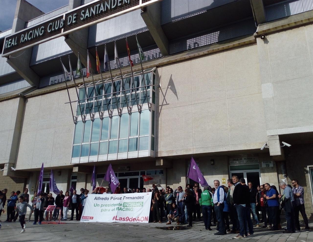 Cerca de medio centenar de sindicalistas se han concentrado este martes a las puertas de las oficinas de Racing, en los campos de Sport del Sardinero, para reclamar al club santanderino que no nombre nuevo presidente al empresario Alfredo Pérez por la "persecución sindical que practican sus empresas".