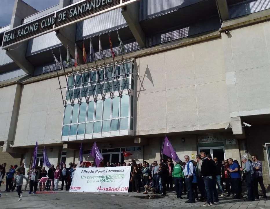 Cerca de medio centenar de sindicalistas se han concentrado este martes a las puertas de las oficinas de Racing, en los campos de Sport del Sardinero, para reclamar al club santanderino que no nombre nuevo presidente al empresario Alfredo Pérez por la "persecución sindical que practican sus empresas".