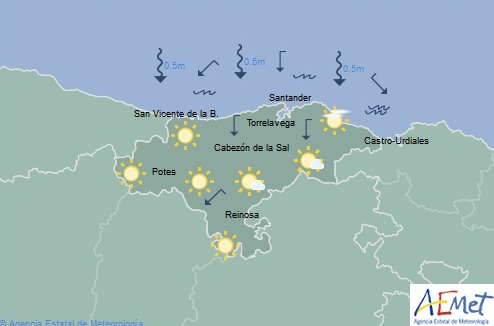 Temperaturas máximas y mínimas previstas: Cabezón de la Sal, 24 y 15 grados; San Vicente de la Barquera, 23 y 16; Santander, 23 y 16; Castro Urdiales, 21 y 17; Potes, 27 y 13; Reinosa, 25 y 10; y Torrelavega, 25 y 14 grados.