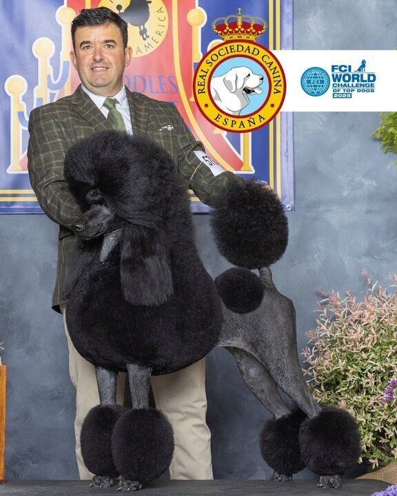 Criada por Rubén Sánchez Abad y Sonia Natividad Acereda (Centro Canino Besaya), esta caniche no solo brilla por su imponente presencia y fidelidad al estándar racial, sino también por su noble carácter, participando incluso en labores como perro de terapia.