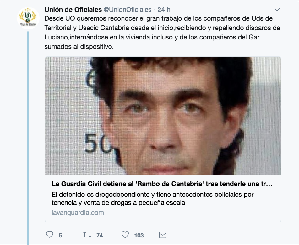 Esta polémica se hace latente en las redes sociales ayer viernes por la mañana entre dos asociaciones del cuerpo, Unión de Oficiales y la Asociación Unificada de la Guardia Civil, la primera dejaba este mensaje: "Desde UO queremos reconocer el gran trabajo de los compañeros de Uds de Territorial y Usecic Cantabria desde el inicio,recibiendo y repeliendo disparos de Luciano,internándose en la vivienda incluso y de los compañeros del Gar sumados al dispositivo."