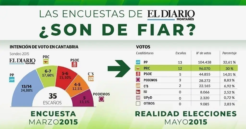 A través de sus canales en redes sociales y whatsapp, el PRC envía la foto que vemos en esta noticia con el texto, "Las encuestas de El Diario Montañes, ¿Son de fiar?", y hacen referencia a la encuesta publicada en 2015 por el mismo medio, en el que según la encuestadora que la realizó, el PRC no pasaría del 17% del voto regional, y finalmente llegó al 30%.