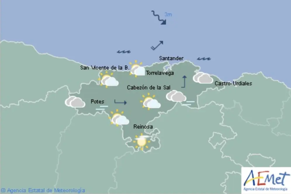 La Agencia Estatal de Meteorología prevé en Cantabria para este día 20, predominio de cielos nubosos con intervalos, sobre todo hacia el sur, sin descartar algunos bancos de niebla en cotas altas.