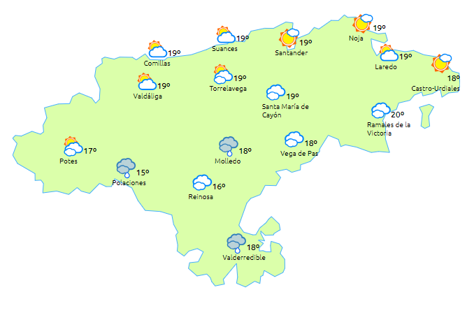 Temperaturas máximas y mínimas previstas: Cabezón de la Sal, 20 y 14 grados; San Vicente de la Barquera, 19 y 14; Santander, 19 y 14; Castro Urdiales, 19 y 15; Potes, 21 y 12; Reinosa, 17 y 9; y Torrelavega, 21 y 13 grados.