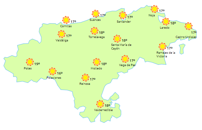 Temperaturas máximas y mínimas previstas: Cabezón de la Sal, 19 y 10 grados; San Vicente de la Barquera, 18 y 11; Santander, 18 y 10; Castro Urdiales, 17 y 11; Potes, 23 y 4; Reinosa, 18 y 7; y Torrelavega, 19 y 9 grados.