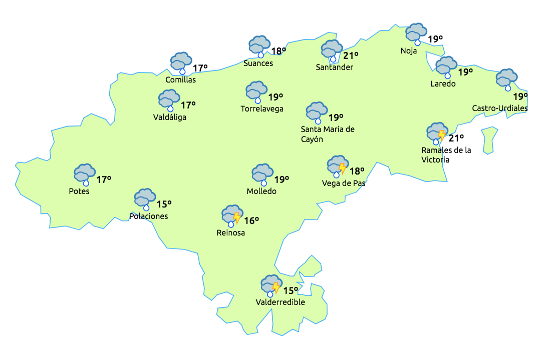 Temperaturas máximas y mínimas previstas: Cabezón de la Sal, 20 y 16 grados; San Vicente de la Barquera, 19 y 16; Santander, 20 y 16; Castro Urdiales, 19 y 15; Potes, 21 y 15; Reinosa, 18 y 10; y Torrelavega, 21 y 17 grados.