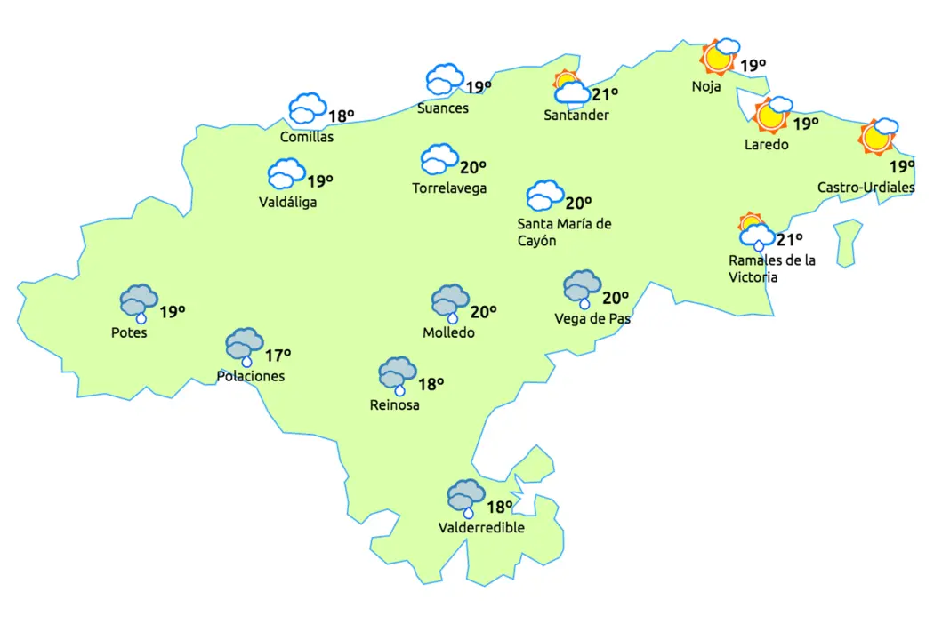 Temperaturas máximas y mínimas previstas: Cabezón de la Sal, 20 y 13 grados; San Vicente de la Barquera, 18 y 13; Santander, 20 y 14; Castro Urdiales, 20 y 14; Potes, 23 y 13; Reinosa, 20 y 8; y Torrelavega, 21 y 14 grados.