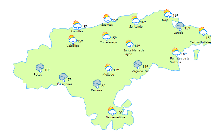 Temperaturas máximas y mínimas previstas: Cabezón de la Sal, 16 y 9 grados; San Vicente de la Barquera, 17 y 10; Santander, 17 y 12; Castro Urdiales, 18 y 10; Potes, 15 y 6; Reinosa, 12 y 2; y Torrelavega, 17 y 10 grados.