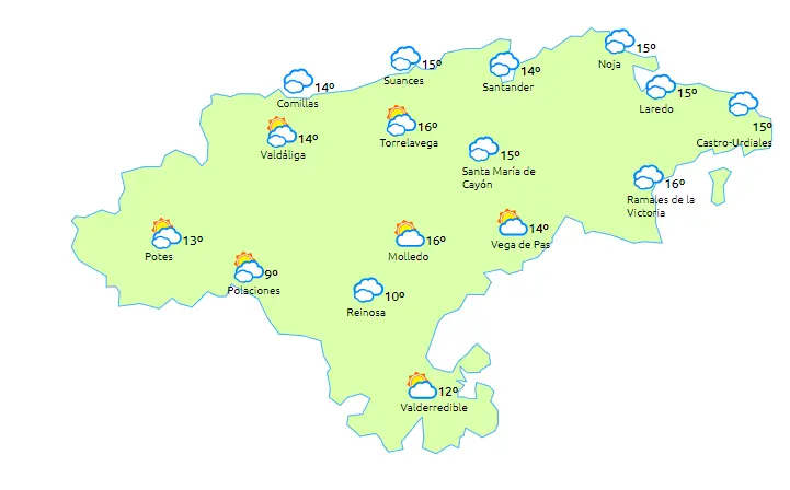 Temperaturas máximas y mínimas previstas: Cabezón de la Sal, 15 y 7 grados; San Vicente de la Barquera, 16 y 8; Santander, 16 y 11; Castro Urdiales, 16 y 8; Potes, 16 y 3; Reinosa, 13 y -; y Torrelavega, 16 y 8 grados.