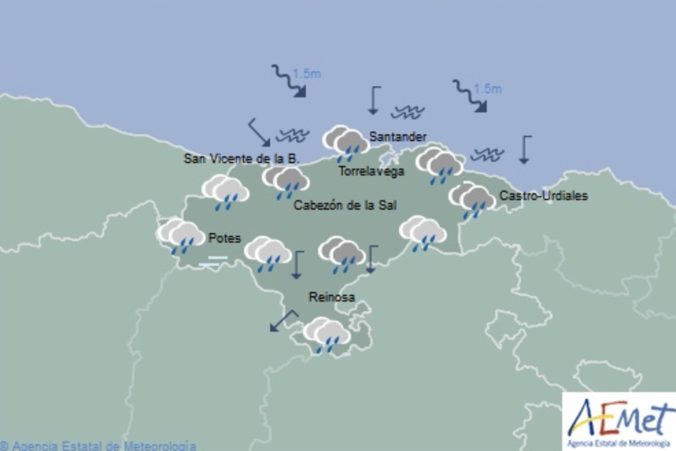 Temperaturas máximas y mínimas previstas: Cabezón de la Sal, 20 y 16 grados; San Vicente de la Barquera, 22 y 17; Santander, 22 y 17; Castro Urdiales, 21 y 18; Potes, 22 y 16; Reinosa, 17 y 9; y Torrelavega, 22 y 17 grados.