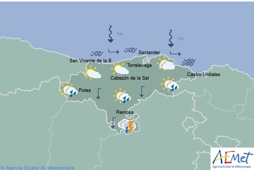 Temperaturas máximas y mínimas previstas: Cabezón de la Sal, 24 y 16 grados; San Vicente de la Barquera, 23 y 17; Santander, 24 y 18; Castro Urdiales, 24 y 17; Potes, 26 y 15; Reinosa, 23 y 11; y Torrelavega, 25 y 17 grados.