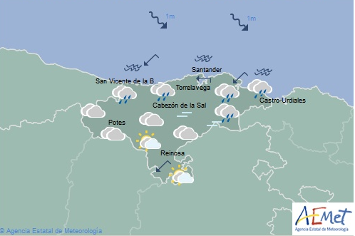 Temperaturas máximas y mínimas previstas: Cabezón de la Sal, 24 y 17 grados; San Vicente de la Barquera, 24 y 18; Santander, 24 y 19; Castro Urdiales, 23 y 17; Potes, 26 y 14; Reinosa, 24 y 11; y Torrelavega, 25 y 17 grados.