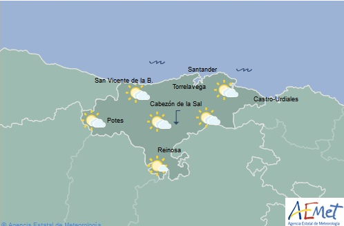 Temperaturas máximas y mínimas previstas: Cabezón de la Sal, 25 y 16 grados; San Vicente de la Barquera, 23 y 18; Santander, 24 y 17; Castro Urdiales, 23 y 17; Potes, 27 y 14; Reinosa, 25 y 10; y Torrelavega, 26 y 16 grados.