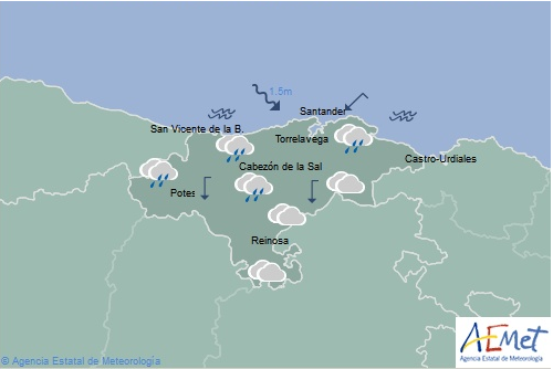Temperaturas máximas y mínimas previstas: Cabezón de la Sal, 22 y 14 grados; San Vicente de la Barquera, 23 y 16; Santander, 23 y 16; Castro Urdiales, 22 y 16; Potes, 22 y 14; Reinosa, 18 y 10; y Torrelavega, 23 y 13 grados.