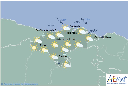 Temperaturas máximas y mínimas previstas: Cabezón de la Sal, 27 y 19 grados; San Vicente de la Barquera, 25 y 20; Santander, 26 y 20; Castro Urdiales, 25 y 19; Potes, 35 y 19; Reinosa, 34 y 15; y Torrelavega, 28 y 20 grados.