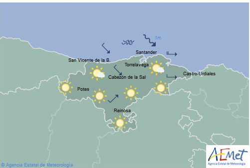 Temperaturas máximas y mínimas previstas: Cabezón de la Sal, 24 y 14 grados; San Vicente de la Barquera, 23 y 15; Santander, 24 y 16; Castro Urdiales, 24 y 16; Potes, 25 y 12; Reinosa, 24 y 9; y Torrelavega, 25 y 13 grados.