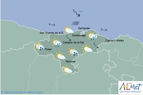 Temperaturas máximas y mínimas previstas: Cabezón de la Sal, 20 y 14 grados; San Vicente de la Barquera, 21 y 16; Santander, 21 y 17; Castro Urdiales, 21 y 13; Potes, 22 y 10; Reinosa, 17 y 7; y Torrelavega, 21 y 15 grados.