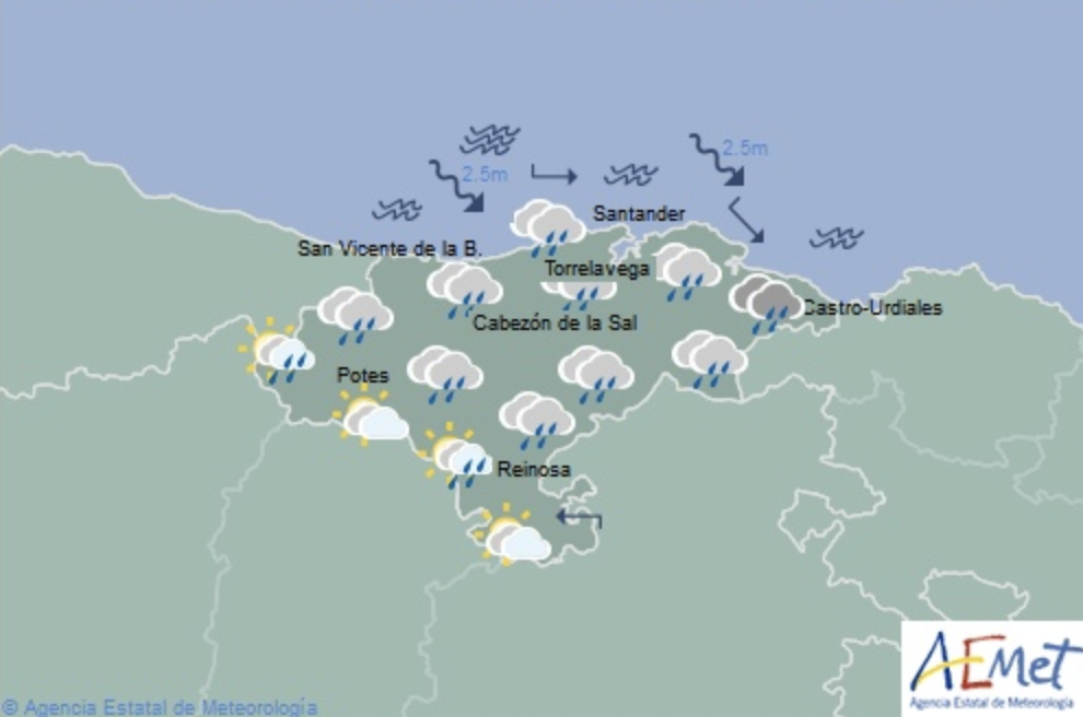 Temperaturas máximas y mínimas previstas: Cabezón de la Sal, 22 y 16 grados; San Vicente de la Barquera, 23 y 18; Santander, 23 y 19; Castro Urdiales, 22 y 18; Potes, 24 y 14; Reinosa, 19 y 10; y Torrelavega, 23 y 17 grados.