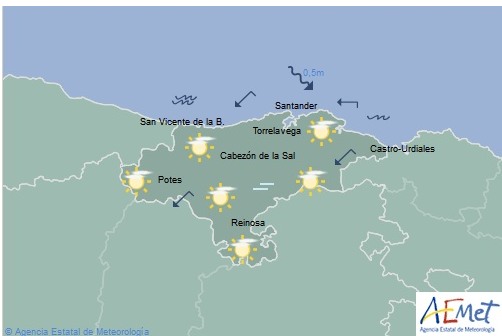 Temperaturas máximas y mínimas previstas: Cabezón de la Sal, 24 y 16 grados; San Vicente de la Barquera, 23 y 17; Santander, 24 y 17; Castro Urdiales, 22 y 15; Potes, 26 y 15; Reinosa, 23 y 11; y Torrelavega, 26 y 16 grados.
