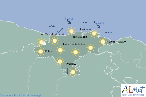 Temperaturas máximas y mínimas previstas: Cabezón de la Sal, 24 y 16 grados; San Vicente de la Barquera, 23 y 16; Santander, 23 y 17; Castro Urdiales, 21 y 15; Potes, 28 y 17; Reinosa, 26 y 10; y Torrelavega, 25 y 15 grados.