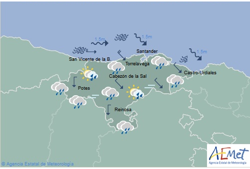 Temperaturas máximas y mínimas previstas: Cabezón de la Sal, 22 y 17 grados; San Vicente de la Barquera, 23 y 17; Santander, 23 y 19; Castro Urdiales, 22 y 19; Potes, 21 y 15; Reinosa, 18 y 11; y Torrelavega, 22 y 18 grados.