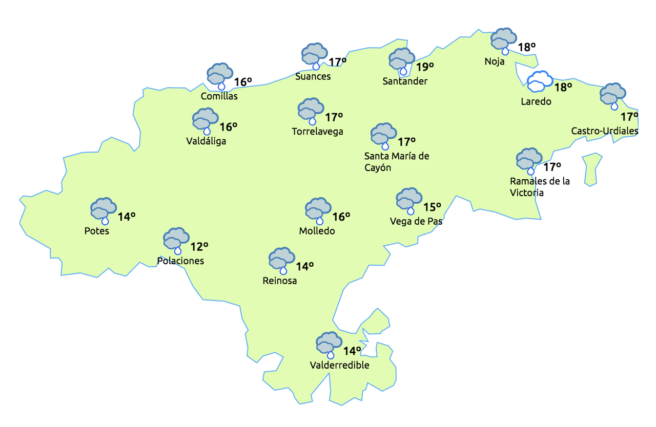 Temperaturas máximas y mínimas previstas: Cabezón de la Sal, 17 y 14 grados; San Vicente de la Barquera, 18 y 14; Santander, 20 y 15; Castro Urdiales, 19 y 16; Potes, 18 y 12; Reinosa, 16 y 9; y Torrelavega, 19 y 15 grados.