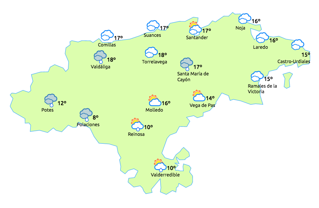 Temperaturas máximas y mínimas previstas: Cabezón de la Sal, 18 y 6 grados; San Vicente de la Barquera, 16 y 5; Santander, 17 y 9; Castro Urdiales, 17 y 8; Potes, 16 y 5; Reinosa, 12 y 2; y Torrelavega, 19 y 8.