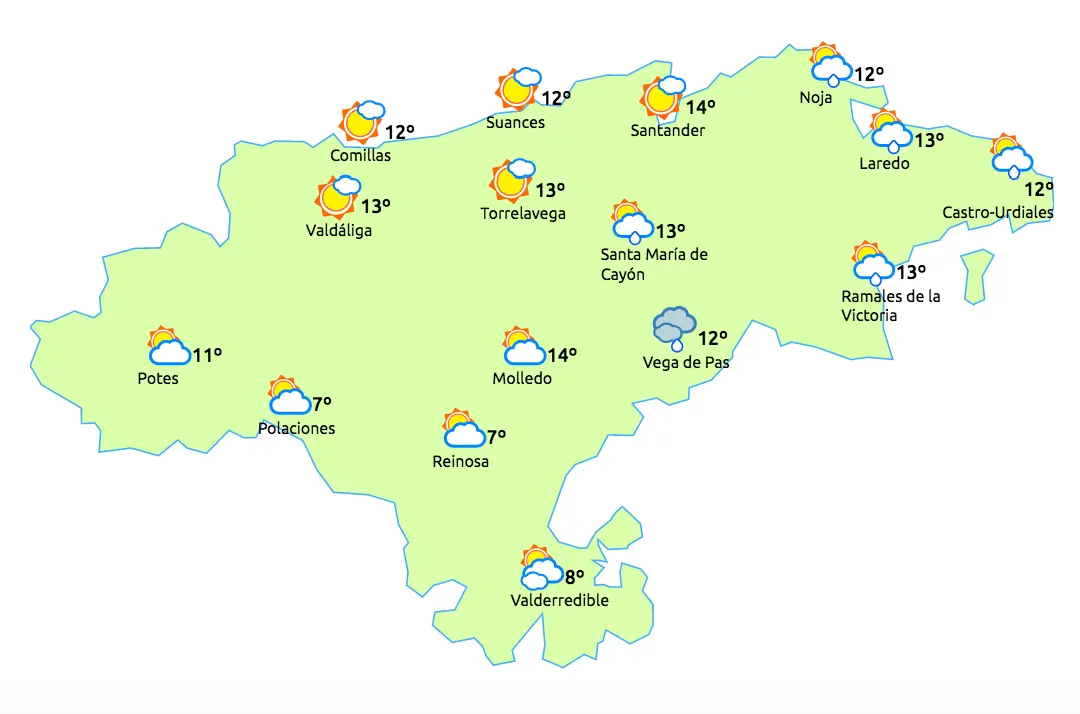 Temperaturas máximas y mínimas previstas: Cabezón de la Sal, 14 y 7 grados; San Vicente de la Barquera, 12 y 7; Santander, 14 y 8; Castro Urdiales, 14 y 8; Potes, 16 y 3; Reinosa, 12 y 0; y Torrelavega, 15 y 7 grados.