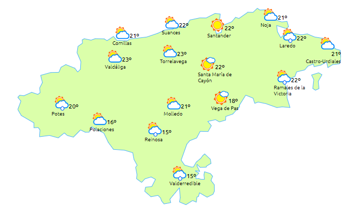 Temperaturas máximas y mínimas previstas: Cabezón de la Sal, 23 y 14 grados; San Vicente de la Barquera, 21 y 14; Santander, 23 y 14; Castro Urdiales, 23 y 14; Potes, 23 y 9; Reinosa, 19 y 3; y Torrelavega, 24 y 14 grados.