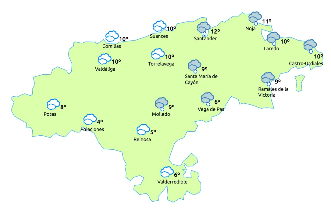 Temperaturas máximas y mínimas previstas: Cabezón de la Sal, 12 y 7 grados; San Vicente de la Barquera, 13 y 7; Santander, 14 y 9; Castro Urdiales, 13 y 8; Potes, 13 y 4; Reinosa, 8 y 2; y Torrelavega, 13 y 8 grados.