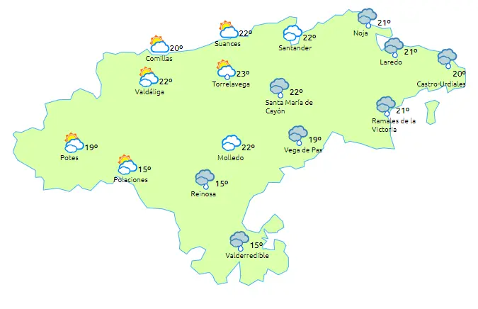 Temperaturas máximas y mínimas previstas: Cabezón de la Sal, 23 y 13 grados; San Vicente de la Barquera, 21 y 14; Santander, 24 y 15; Castro Urdiales, 24 y 13; Potes, 23 y 12; Reinosa, 19 y 11; y Torrelavega, 24 y 13 grados.
